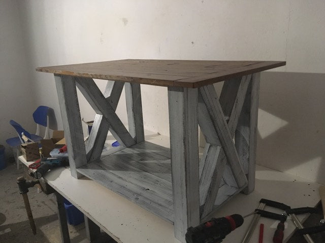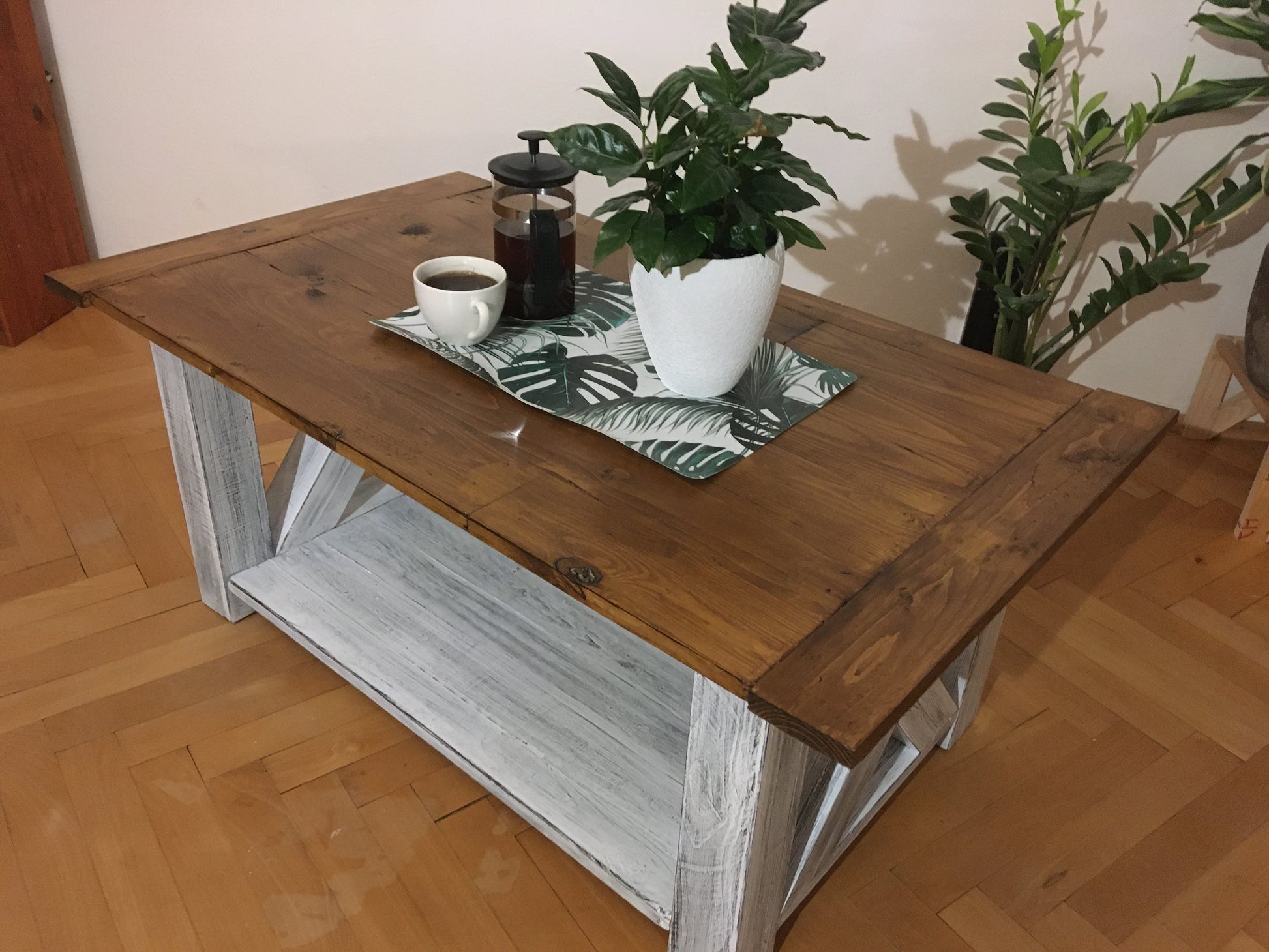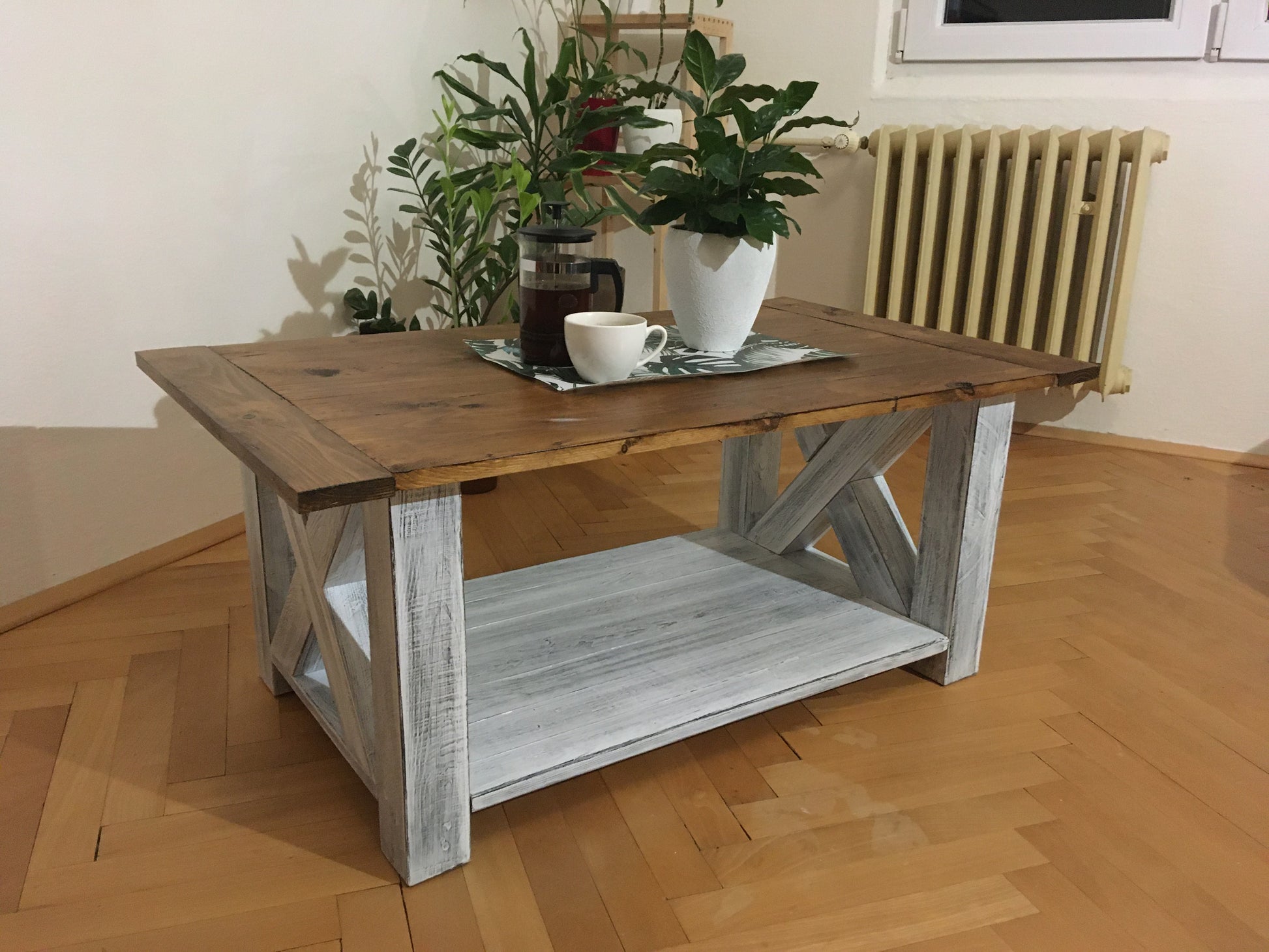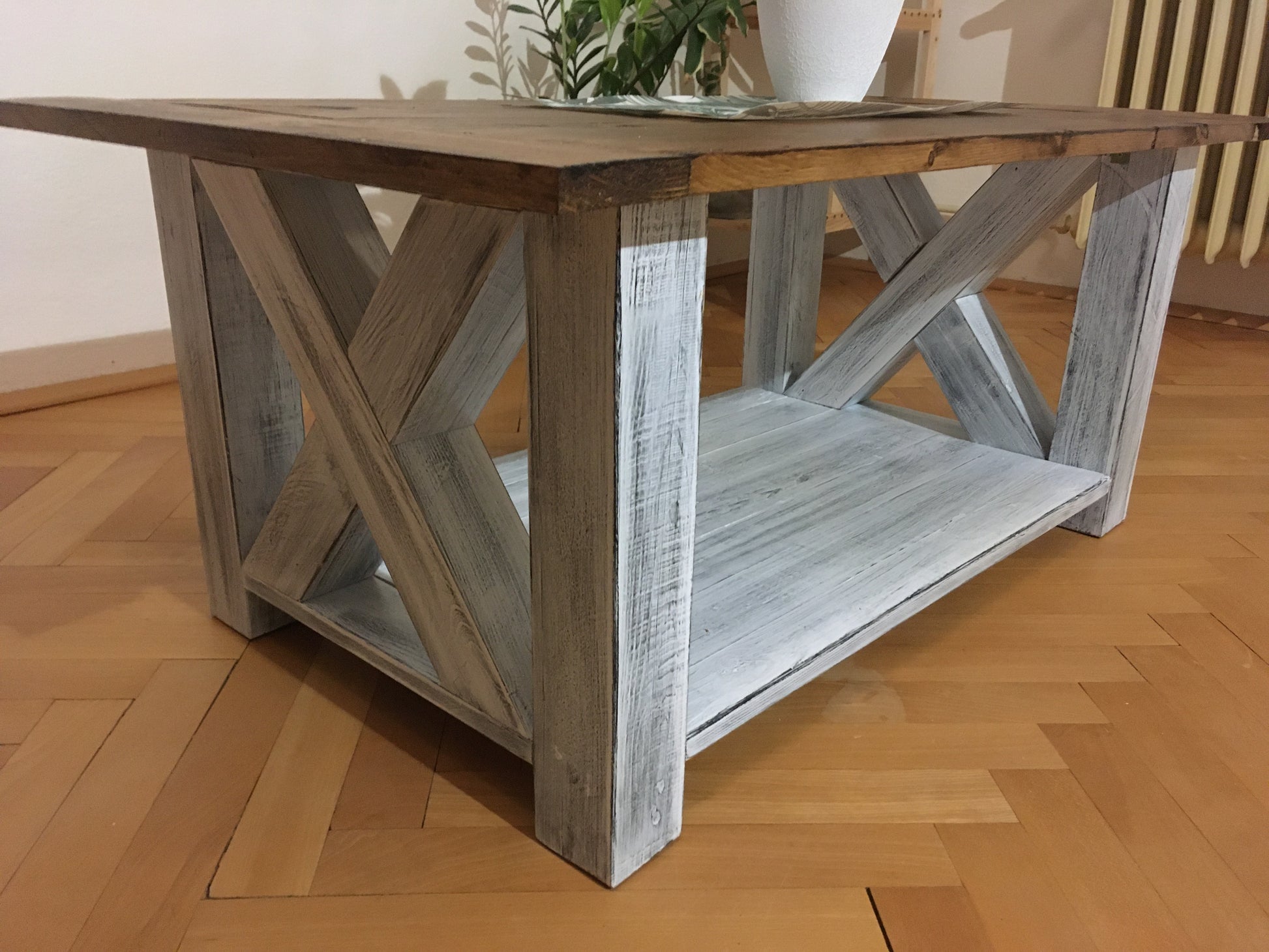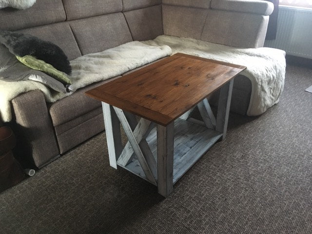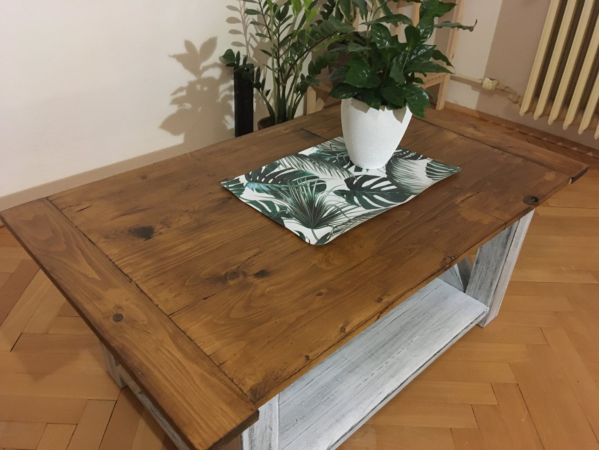 Mohutný konferenční stolek je vyroben čistě z bukového dřeva. Spodní část konstrukce je opatřena velmi oblíbenou patinou. Napřed jsem použil černou barvu, kterou jsem následně překryl bílou barvu a tu pak částečně vybrousil. Výsledkem je rustikální vzhled, který má napodobit opotřebení a zvětrávání barvy. Poté je vše nalakováno polyuretanovým lakem, který barvu chrání před poškrábáním a dodává mechanickou odolnost.