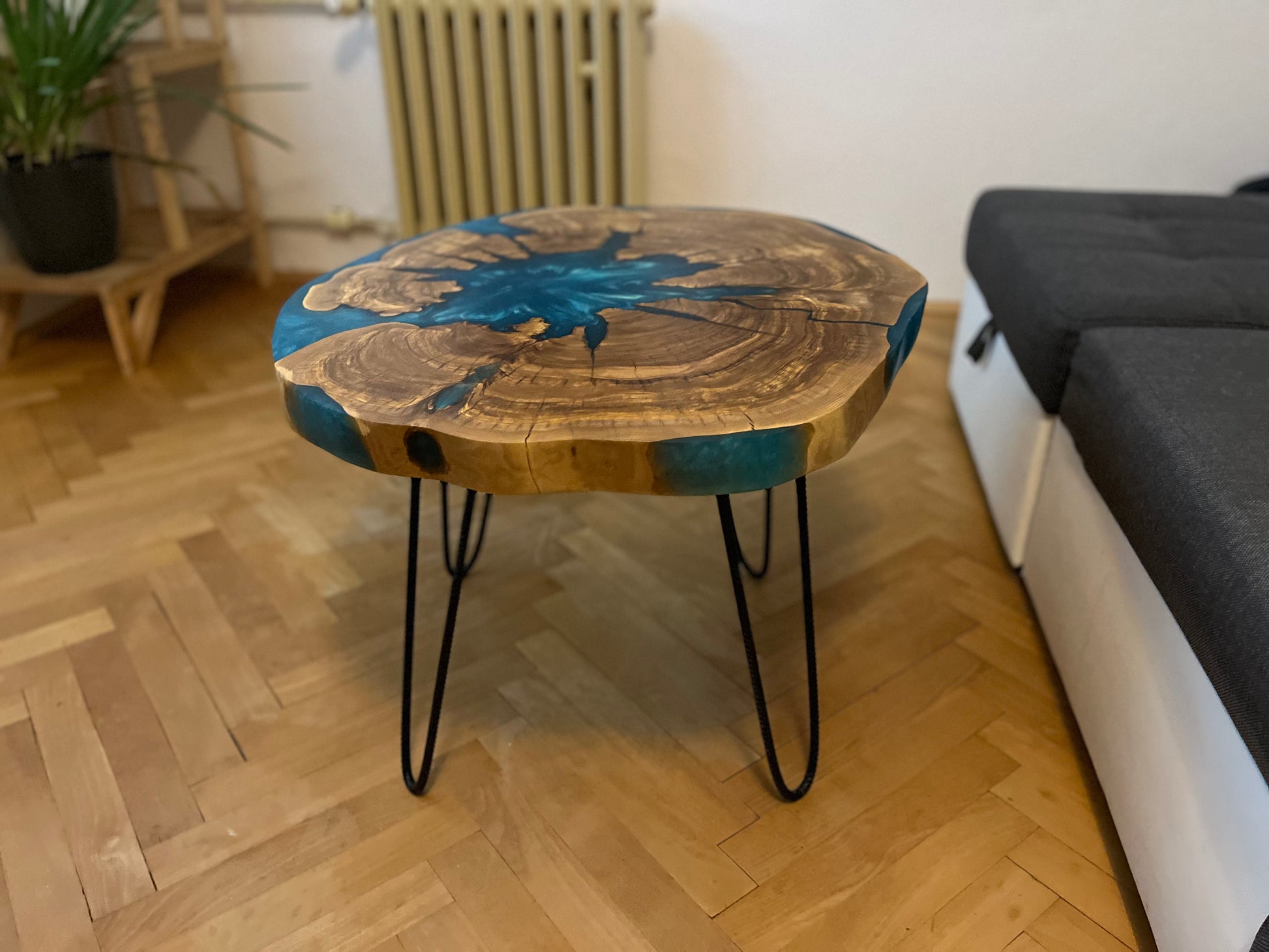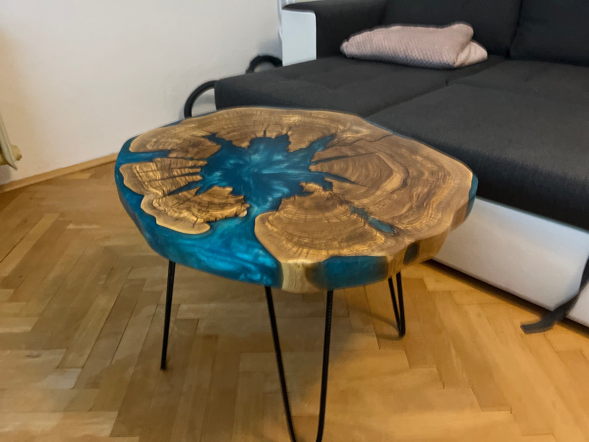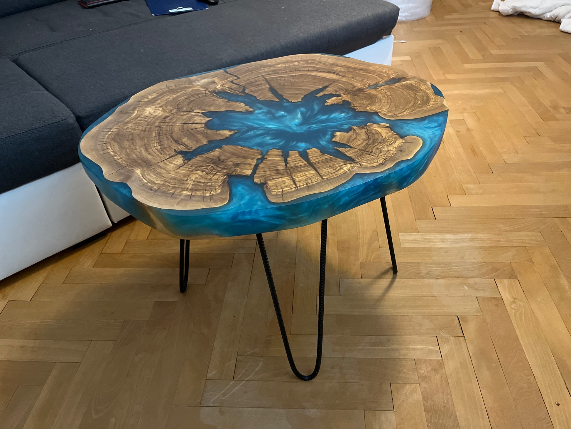 Tenhle krásný konferenční stolek byl vytvořen snoubením epoxidové pryskyřice a olivového koláče. Jako barvivo je použit metalický pigment v odstínu Bora Bora. Deska je ošetřena polyuretanovám lakem.