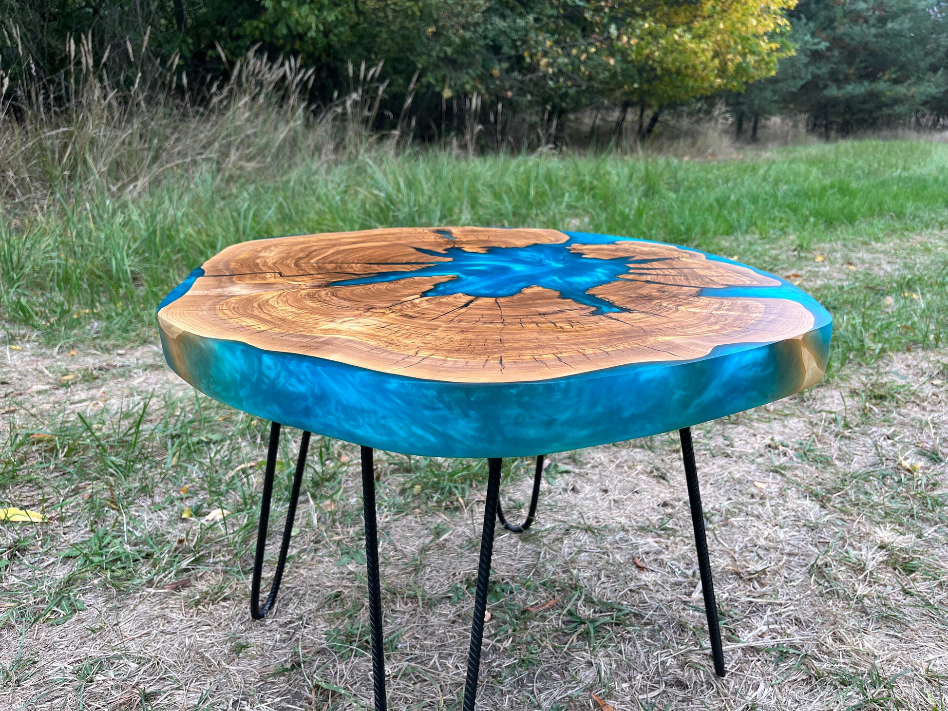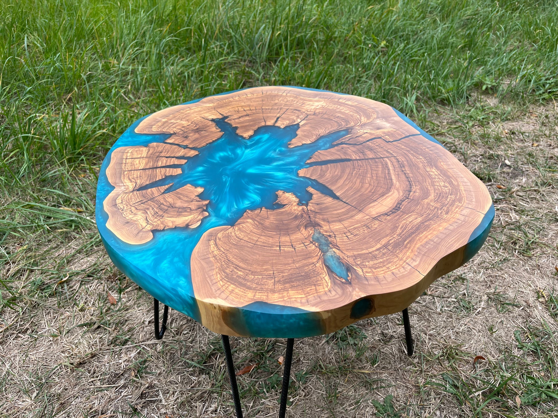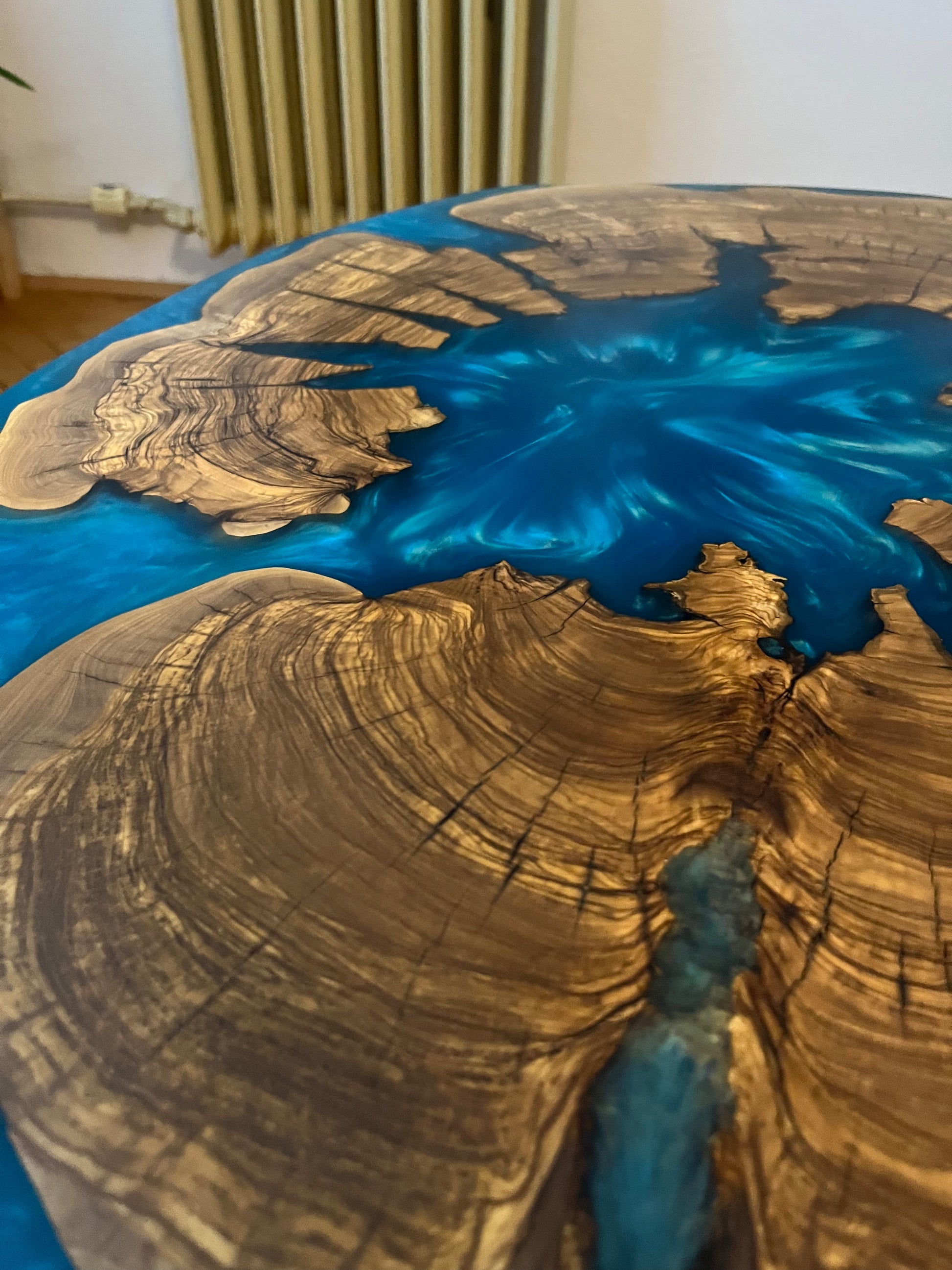 Tenhle krásný konferenční stolek byl vytvořen snoubením epoxidové pryskyřice a olivového koláče. Jako barvivo je použit metalický pigment v odstínu Bora Bora. Deska je ošetřena polyuretanovám lakem.