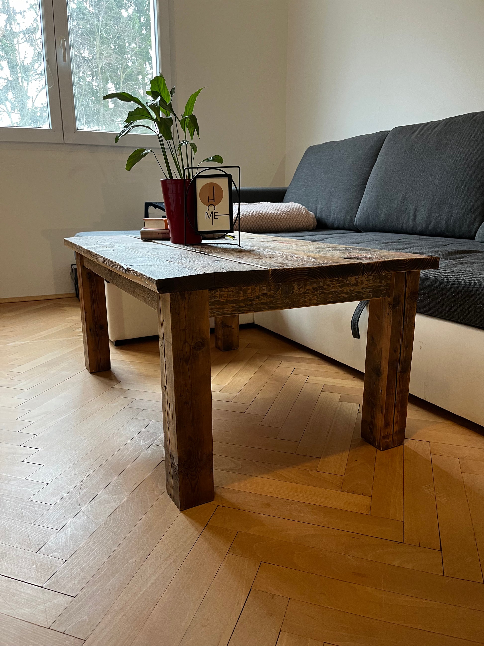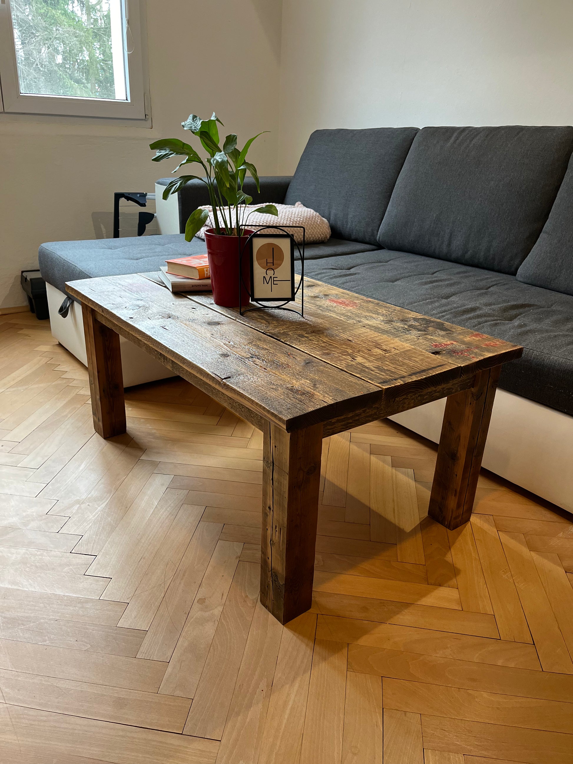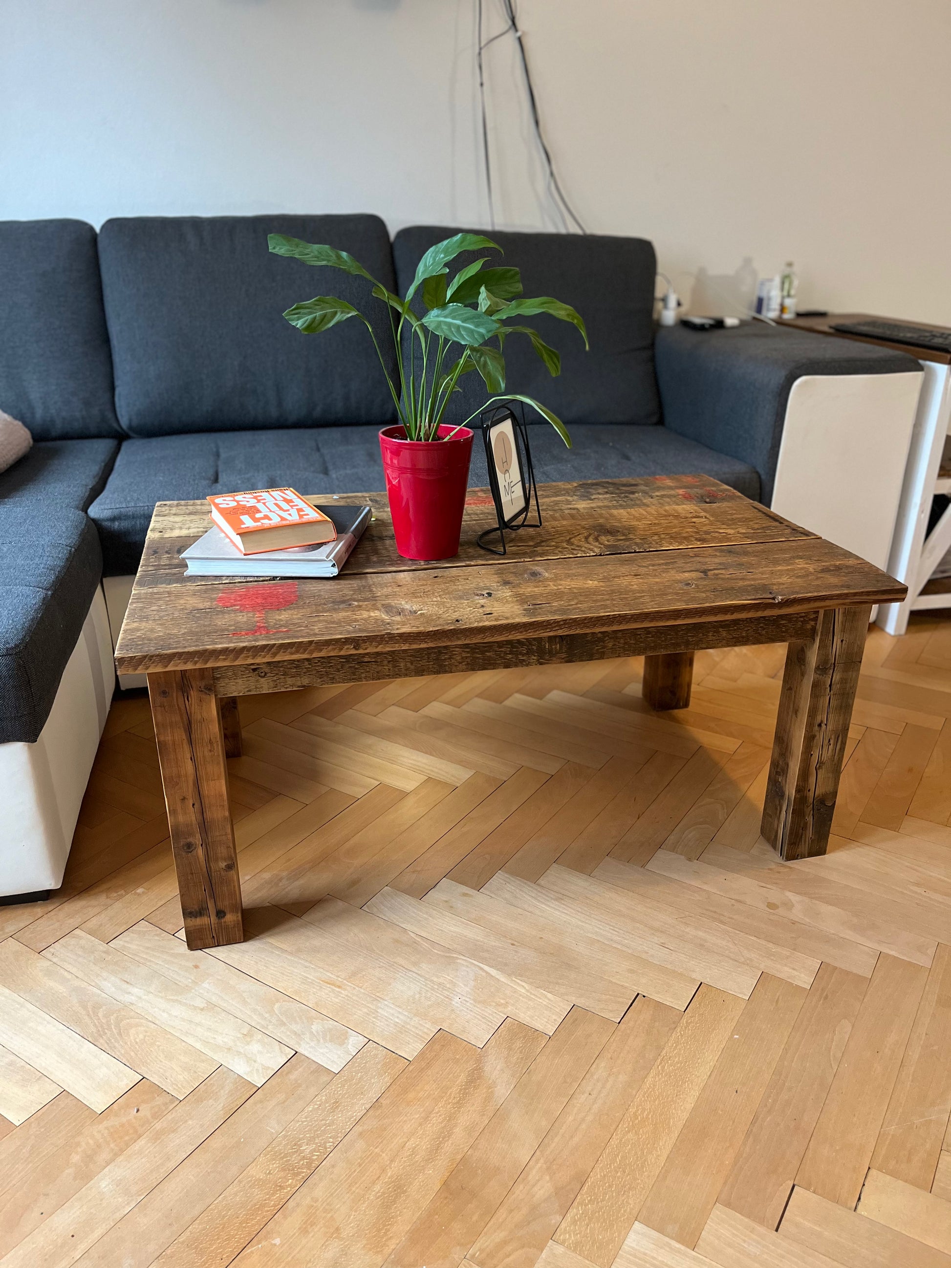 Tenhle konferenční stoleček byl vyroben pouze ze starého dřeva, které jsem našel u svého taťky v kumbálu. Dřevo nejspíše pochází z přepravního boxu, jelikož jsou na něm číselné informace, symbol Křehké a symbol Neklopit. Všechny tyto prvky jsem ve výsledném produktu zachoval.