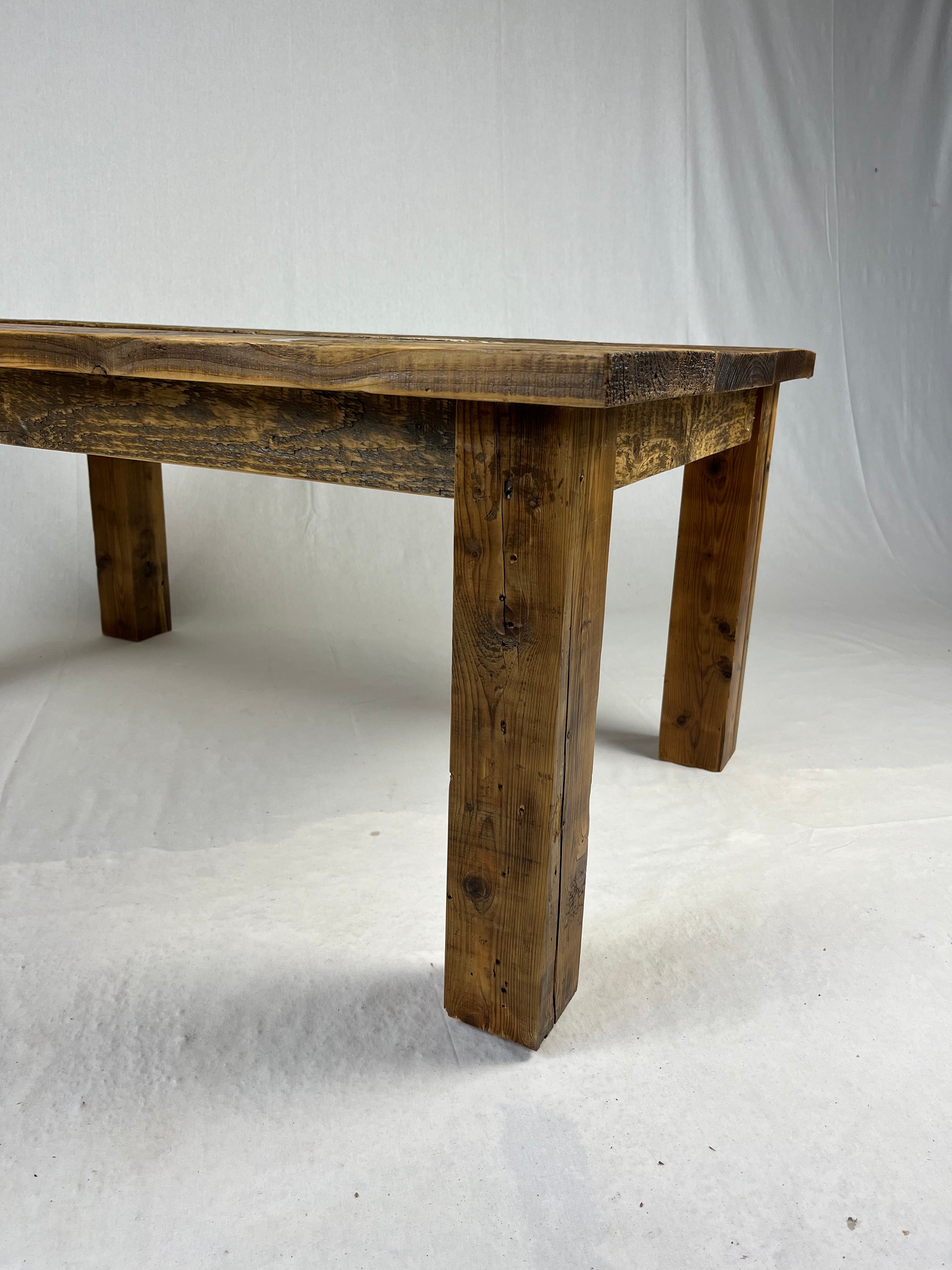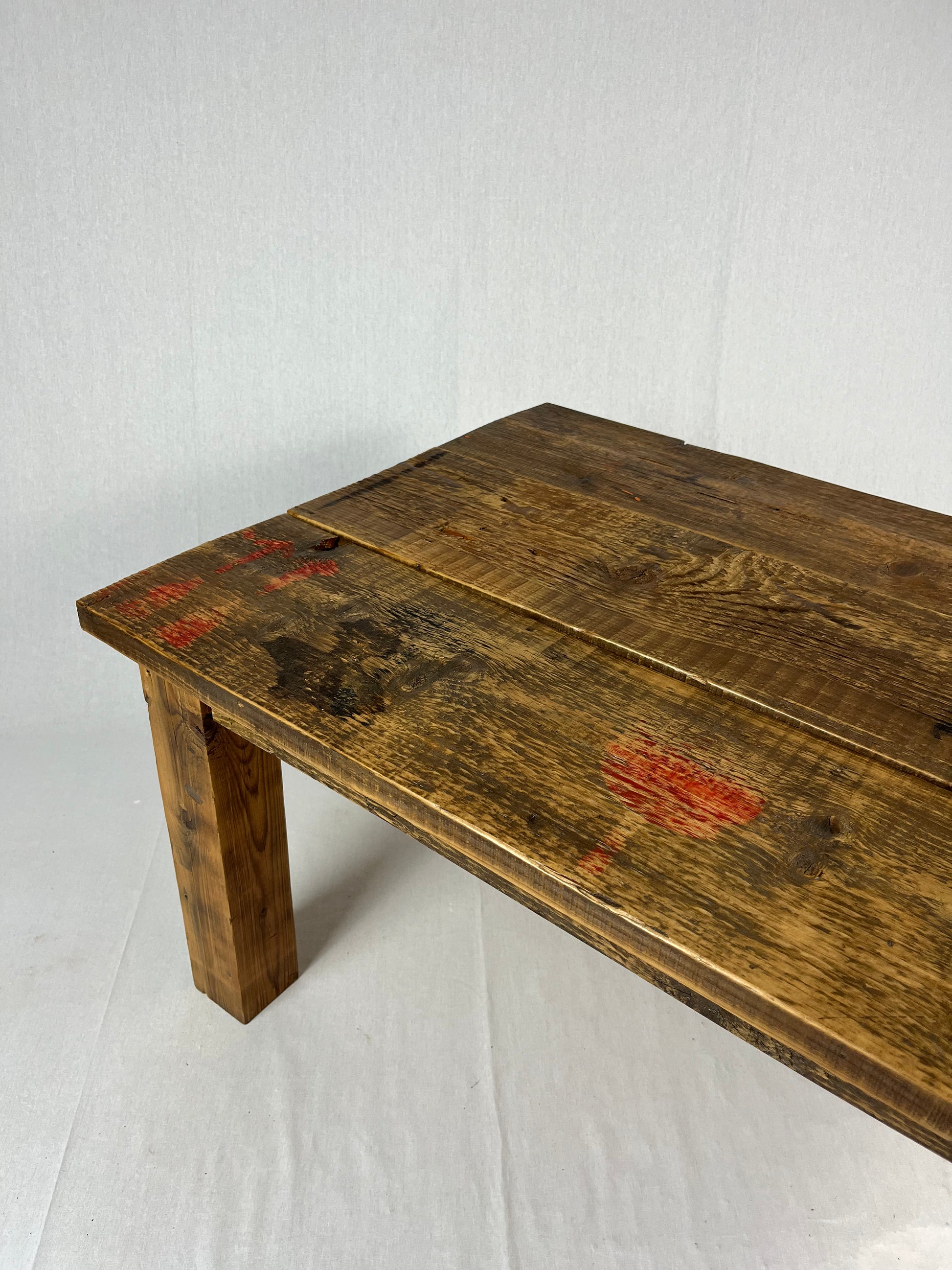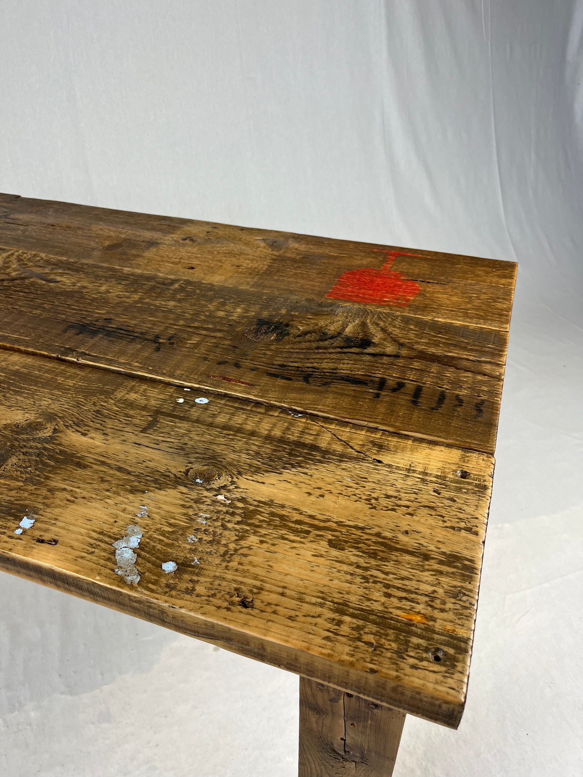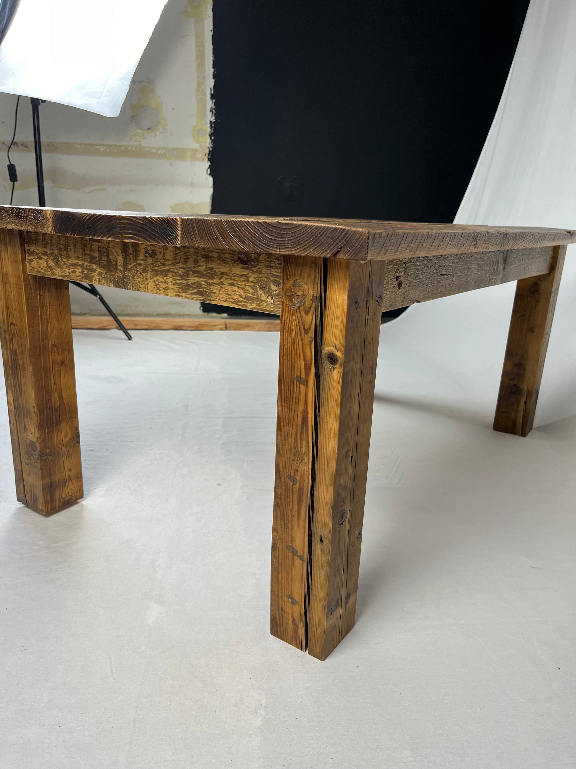 Tenhle konferenční stoleček byl vyroben pouze ze starého dřeva, které jsem našel u svého taťky v kumbálu. Dřevo nejspíše pochází z přepravního boxu, jelikož jsou na něm číselné informace, symbol Křehké a symbol Neklopit. Všechny tyto prvky jsem ve výsledném produktu zachoval.