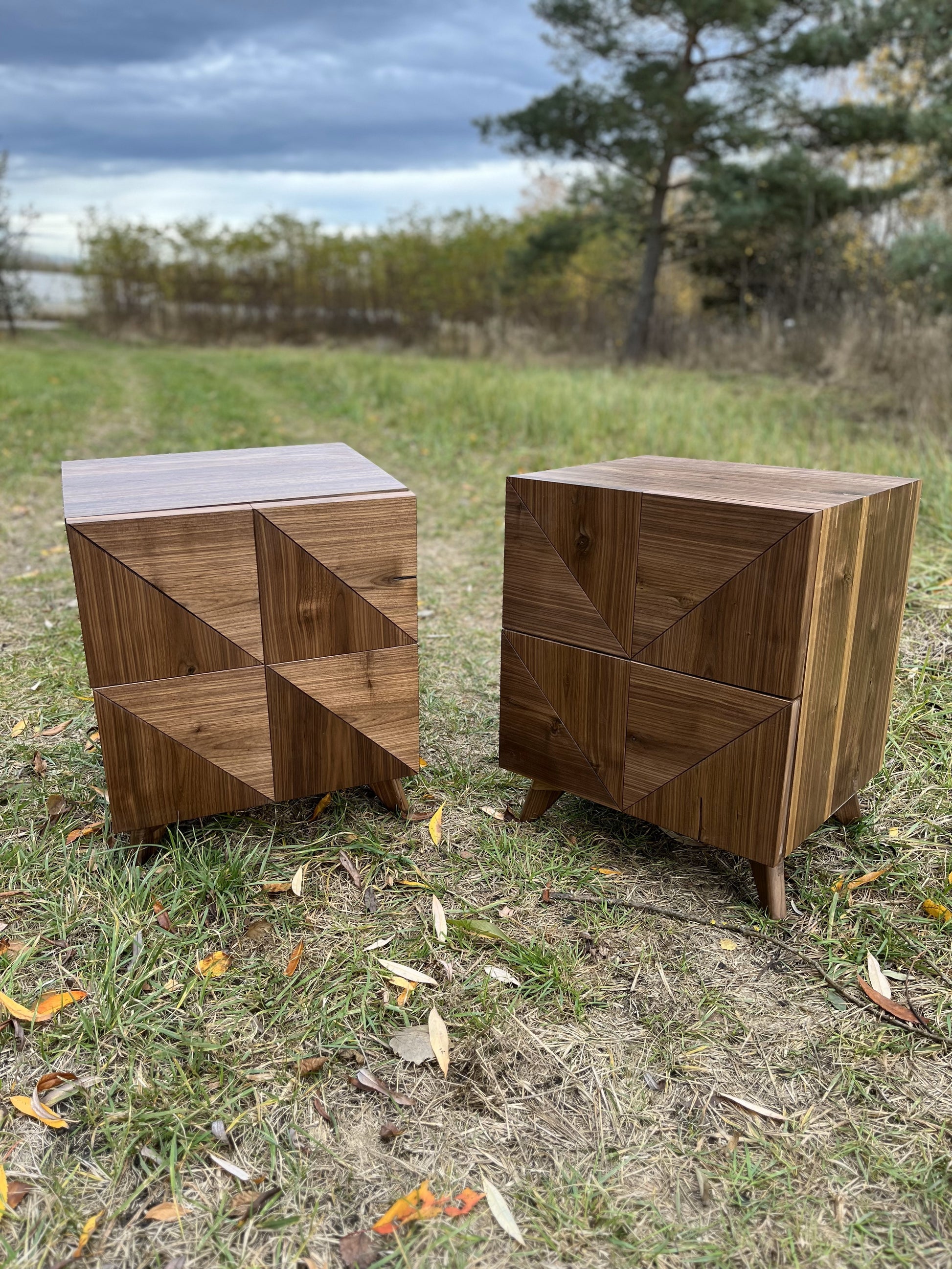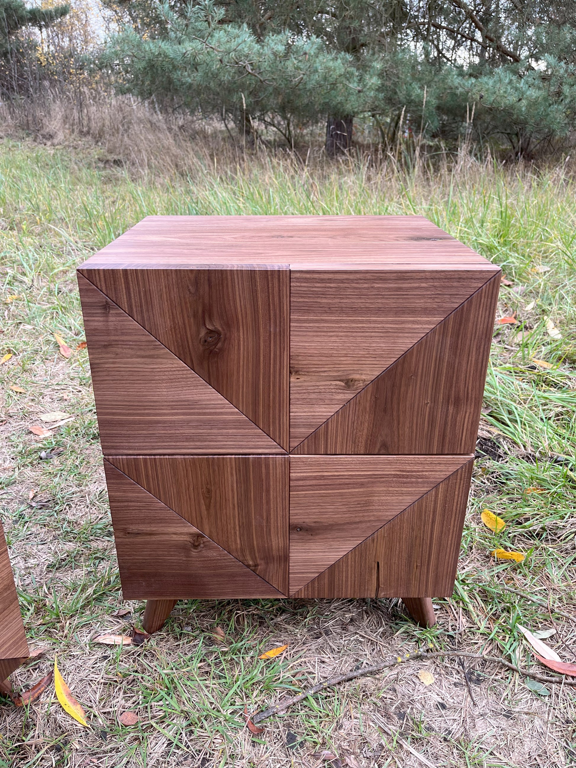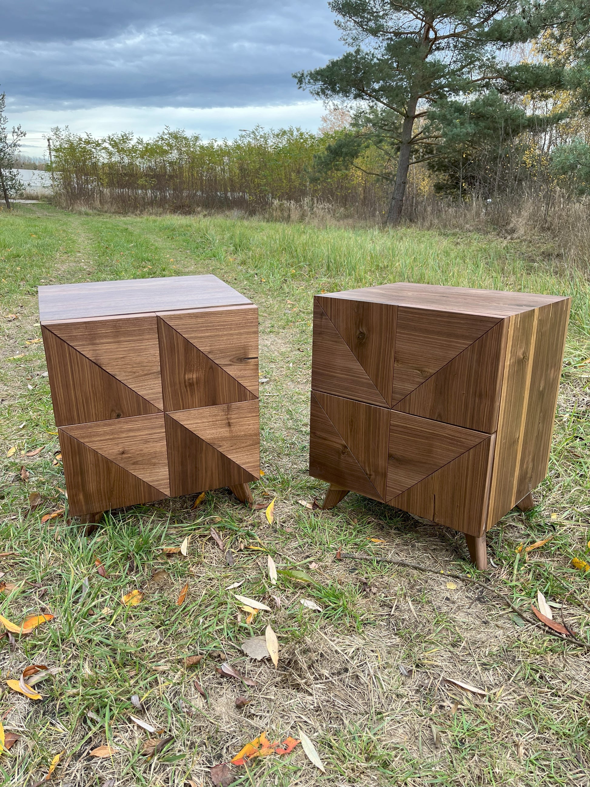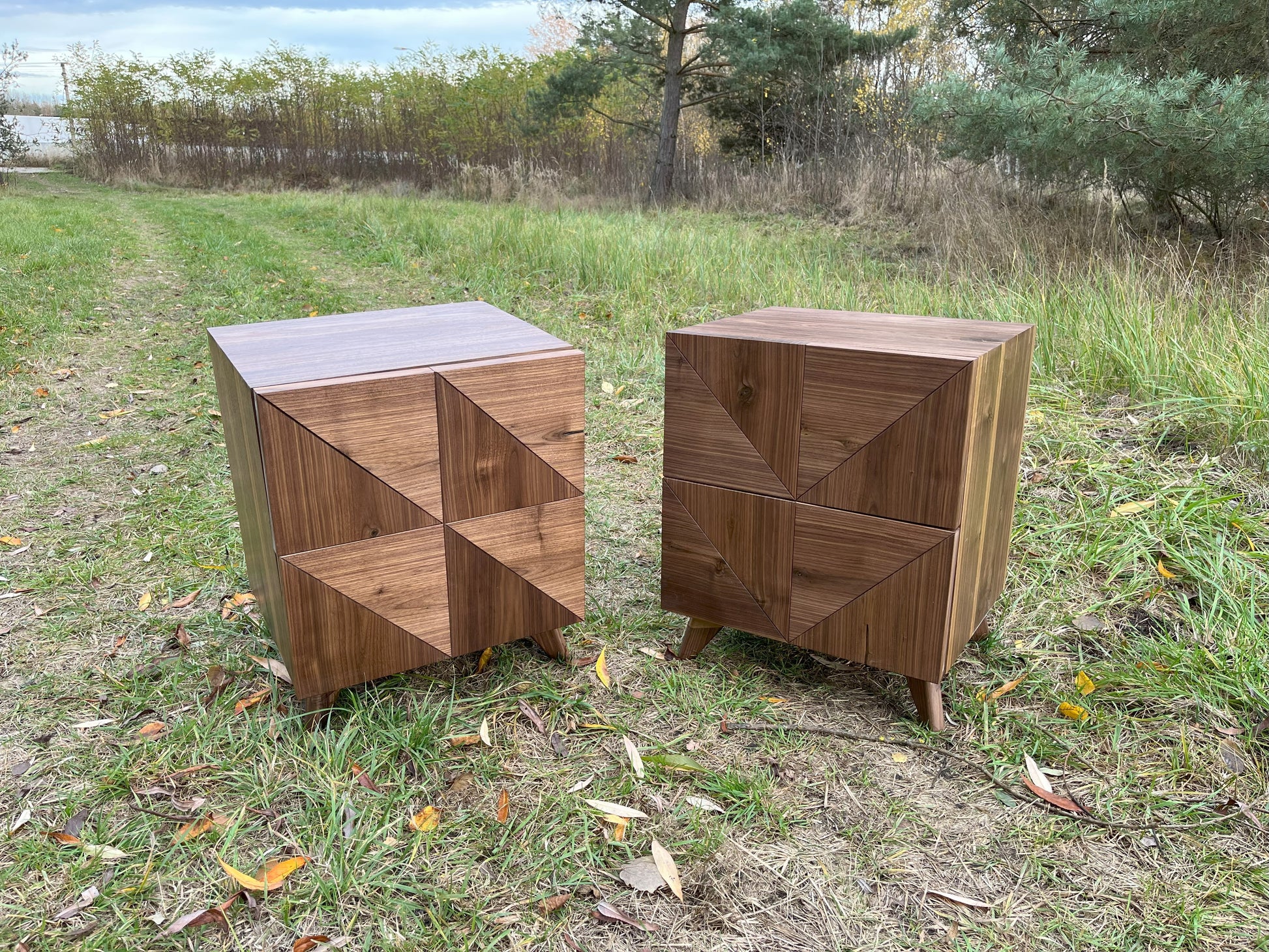 Tyto noční stolky byly vyrobeny z exotické dřeviny - z amerického ořechu. Strom má elegantní tmavou barvu a v současné době je první volbou výrobců luxusního nábytku.